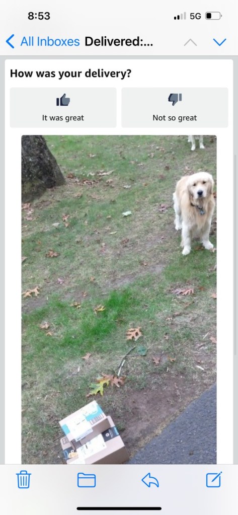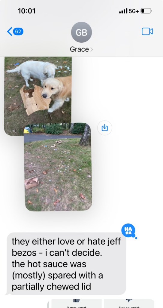 Kathy was nothing if not a lover of dogs. And on the lighter side, our fuzzy family members received an Amazon package one day that squeaked when the driver dropped the package in the yard because it was, in fact, actually for them. But now they think every package is for them. And we come home to find our yard strewn with hot sauce and shredded paper towel.